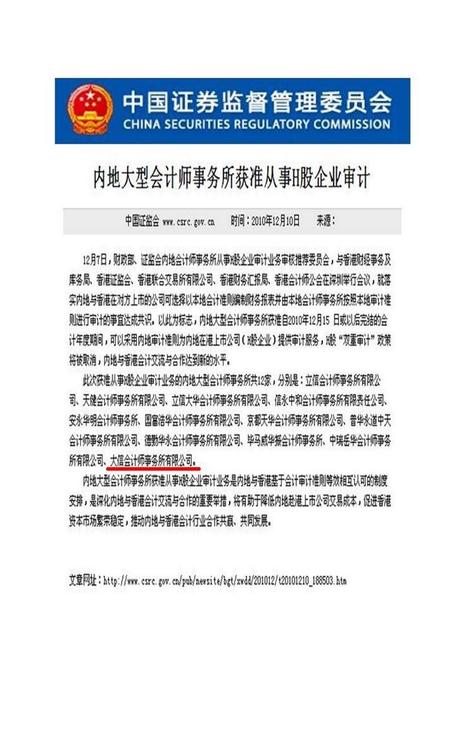大信以其規模和實力,獲得會計中介機構各種執業資格。其中具有財政部、中國證監會及建設部等批準授予的特許資格、H股企業審計業務資格。