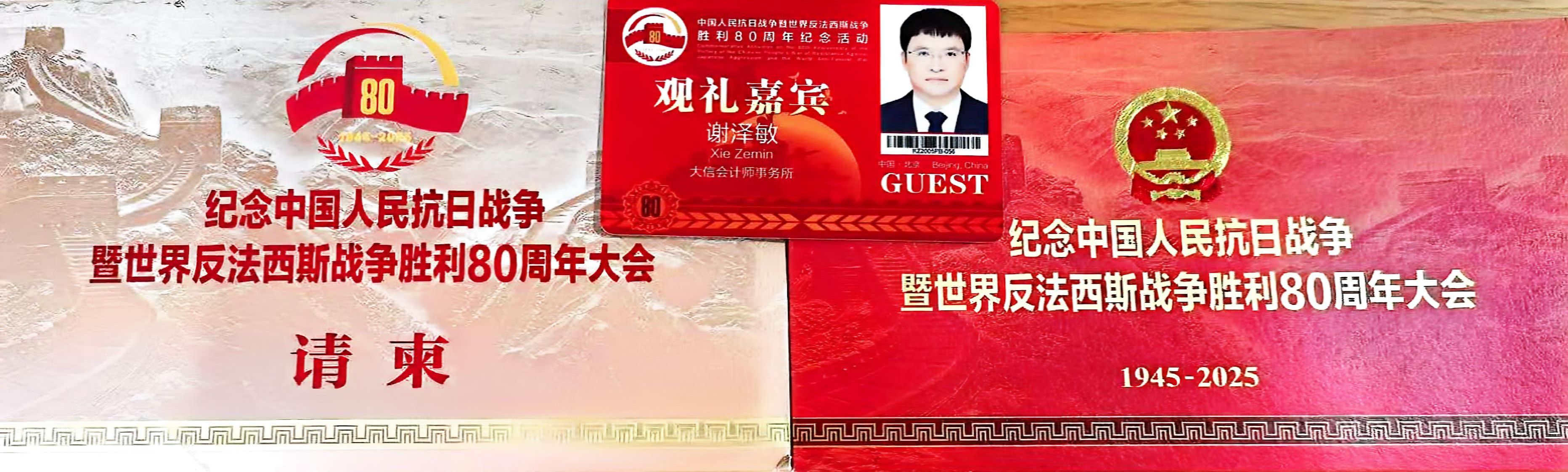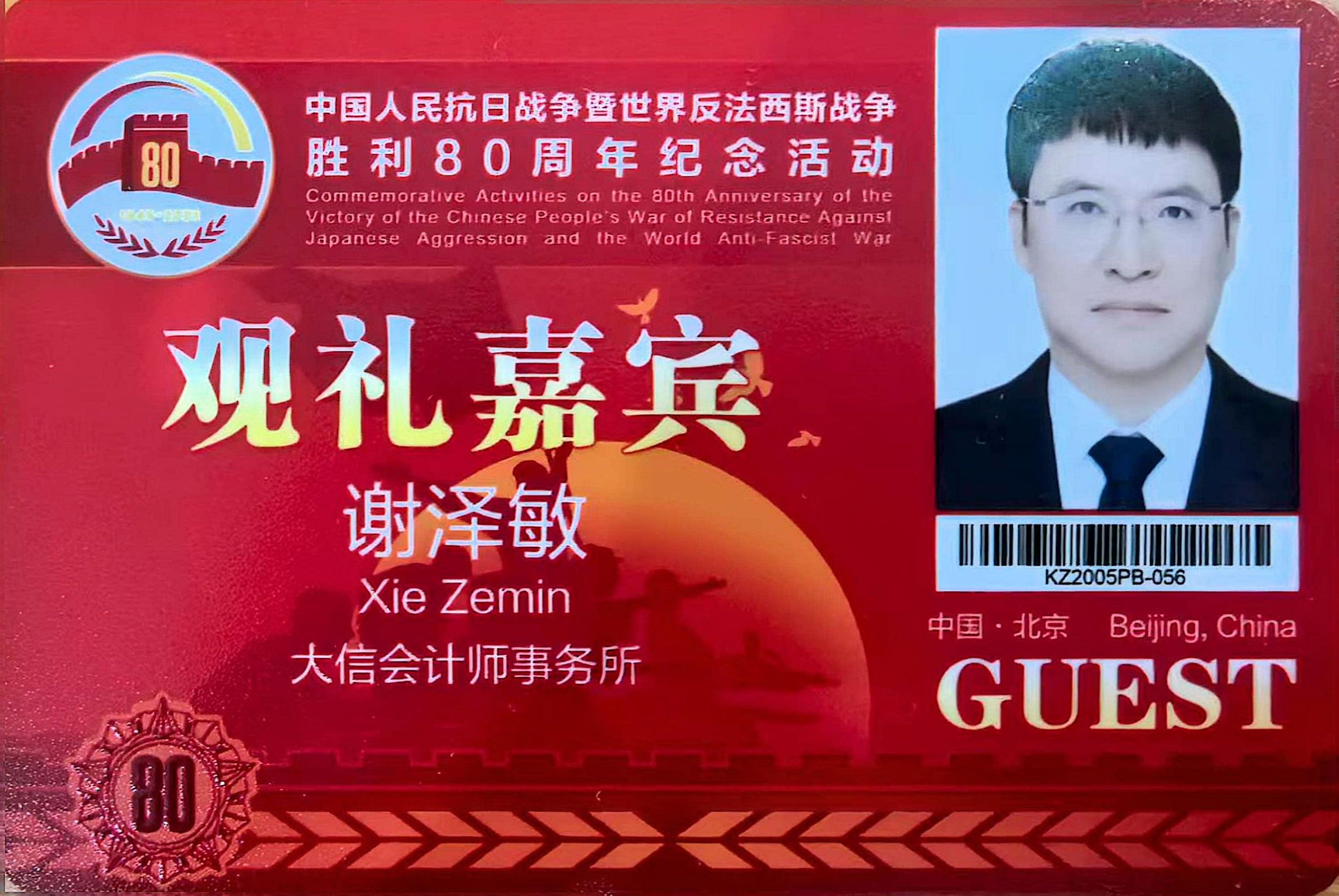 9月3日上午,紀念中國人民抗日戰爭暨世界反法西斯戰爭勝利 80 周年大會在北京天安門廣場隆重舉行。中共中央總書記、國家主席、中央軍委主席習近平,發表重要講話并檢閱部隊。經市委統戰部推薦,大信會計師事務所(特殊普通合伙)首席合伙人謝澤敏受邀參加現場觀禮活動。